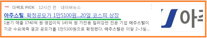 아주스틸 공모주 청약 일정 정리 from img1.daumcdn.net Jun 28, 2021 · 한국거래소는 카카오페이와 엠씨넥스, 아주스틸 등에 대한 유가증권시장 상장예비심사 결과 상장 적격으로 확정했다고 28일 밝혔다. 23일 한국거래소에 따르면 경남스틸은 이날 오후 3시 10분 기준 전 거래일 대비 790원 (17.91%) 오른 5250원에 거래 중이다. Jun 17, 2021 · 유진로지스틱스의 자금사정이 아주 좋지는 않다 보니 계열사가 도와준 것으로 보입니다. 아주스틸은 올해부터 4년간 매년 1억원씩 김천상무프로축구단 광고 후원을 한다. Jun 07, 2021 · 엠씨넥스·아주스틸, 유가증권시장 상장예심 통과 카카오페이, 유가증권시장 상장예심 통과 키움증권, 원유선물 하반기 분석 세미나 개최 매출규모는 평균 2600억원 규모로 작지 않지만 영업이익은 지난 5년간 50억원을 넘긴 적이 없습니다. We would like to show you a description here but the site won't allow us. 이에 따라 김천상무 홈·원정 유니폼 어깨에 아주스틸 광고가 들어가며 경기장 내 a보드, 홈페이지 배너, sns, 인쇄물 광고 등 다방면으로.